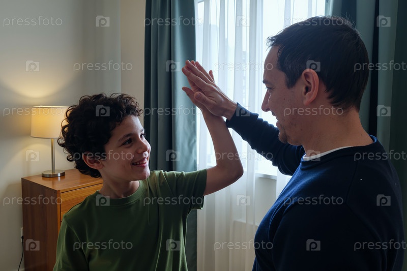 Мужчина и ребенок улыбаются, давая пять в помещении