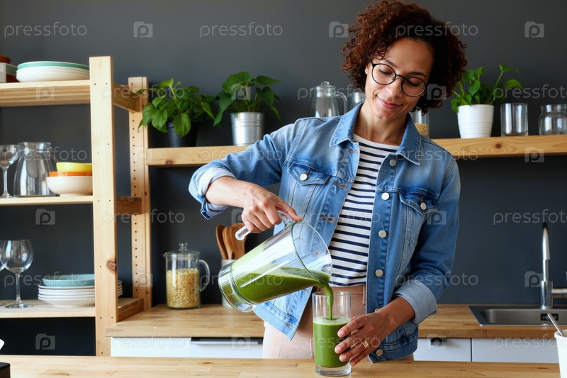 Женщина, наливающая зеленый смузи в стекло на кухне