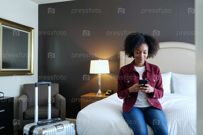 Молодая взрослая чернокожая женщина, сидящая на кровати с помощью смартфона в гостиничном номере