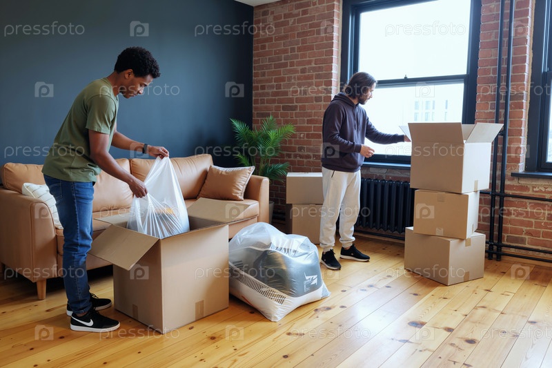 Молодые взрослые мужчины упаковывают свои вещи в коробки, переезжая в квартиру