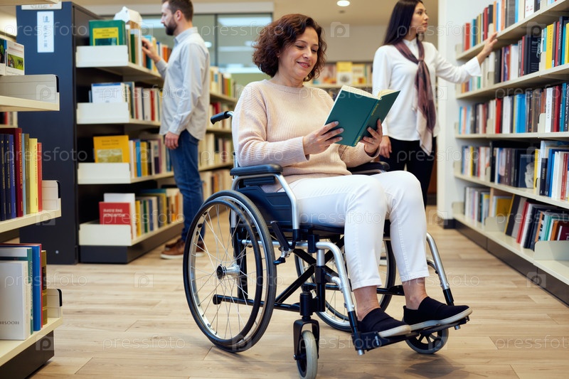 Женщина среднего возраста с инвалидностью читает книгу в библиотеке