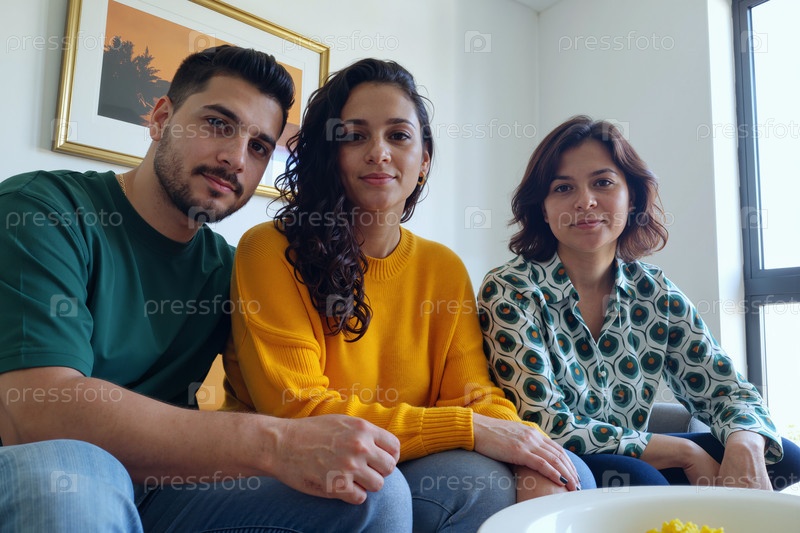 Портрет трех молодых и латиноамериканских людей, улыбающихся в помещении