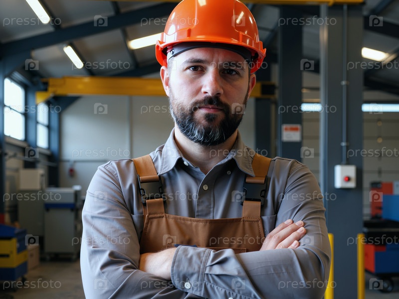 Портрет мужчины среднего возраста, одетого в жесткую шляпу и стоящего на фабрике