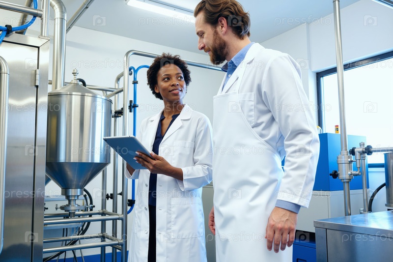 Молодая взрослая чернокожая женщина и мужчина обсуждают процесс в лаборатории