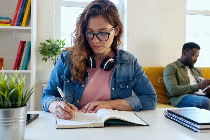 Молодая женщина изучает и делает заметки в современном совместном рабочем пространстве