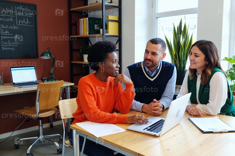 Молодые взрослые многоэтнические коллеги, сотрудничающие вокруг ноутбука в офисе