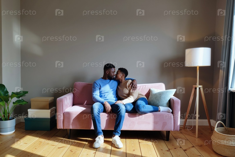 Молодая чернокожая пара отдыхает вместе на диване в современной гостиной