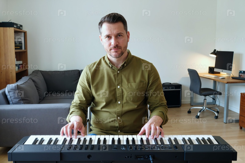 Портрет молодого взрослого мужчины, играющего на цифровом пианино в домашнем офисе