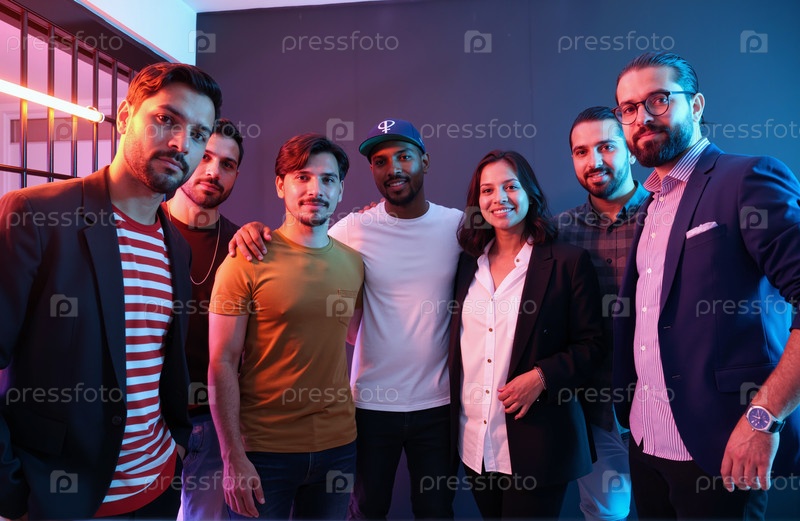 Разнообразная группа молодых взрослых, улыбающихся и позирующих вместе в помещении