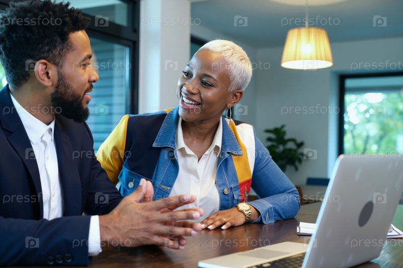 Молодой взрослый чернокожий мужчина и молодая взрослая черная женщина обсуждают бизнес-стратегию