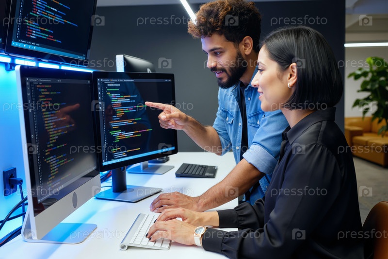 Молодая женщина и молодой человек сотрудничают над проектом разработки программного обеспечения
