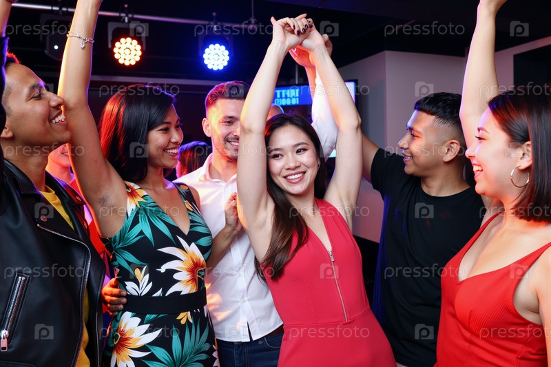Группа разнообразных молодых взрослых, танцующих и празднующих вместе на вечеринке