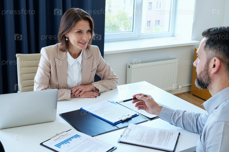 Женщина среднего возраста интервьюирует молодого взрослого мужчину в офисе