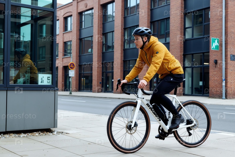 Молодой взрослый азиатский мужчина едет на велосипеде вдоль городской улицы, нося шлем