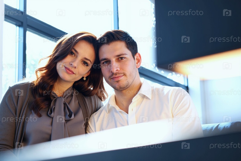 Портрет молодой пары, улыбающейся и отдыхающей вместе в помещении