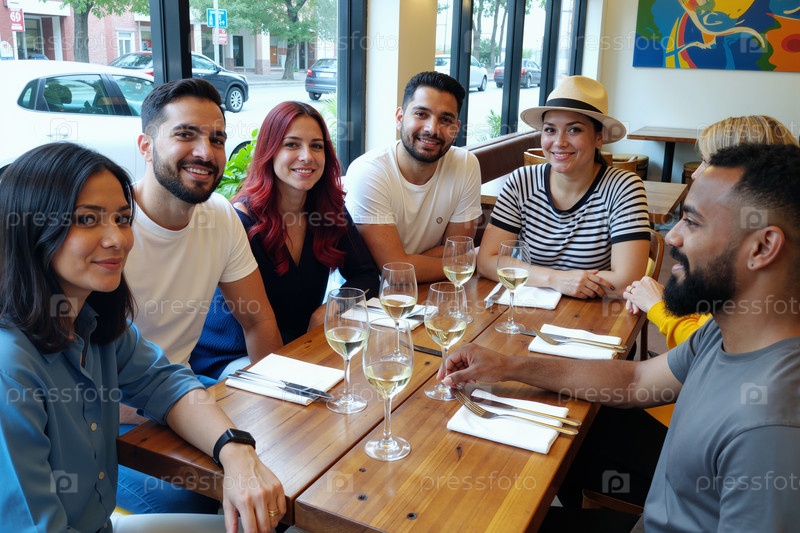 Группа молодых мультиэтнических взрослых, улыбающихся и общающихся за столом в ресторане