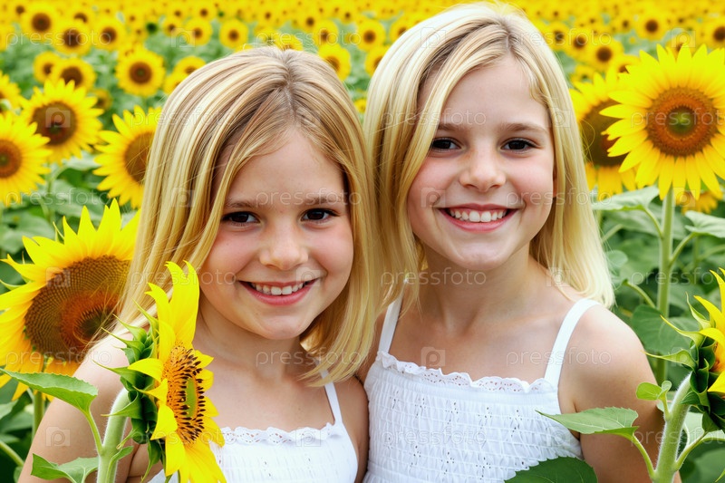 Две девушки, улыбающиеся вместе, стоящие среди цветущих подсолнечников