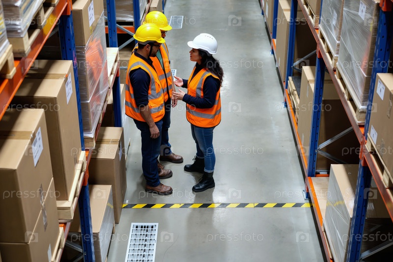 Молодые взрослые многоэтнические складские работники обсуждают процесс управления запасами