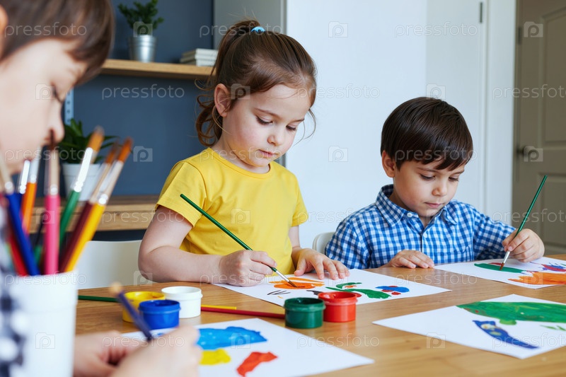 Группа детей, рисующих картины вместе во время художественной деятельности