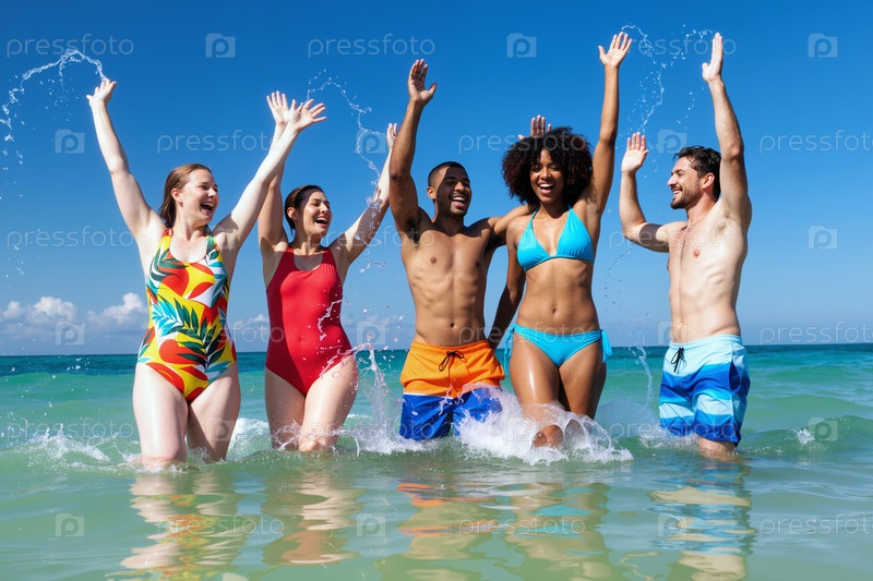 Разнообразные молодые взрослые наслаждаются летними каникулами, брызгая водой на пляже