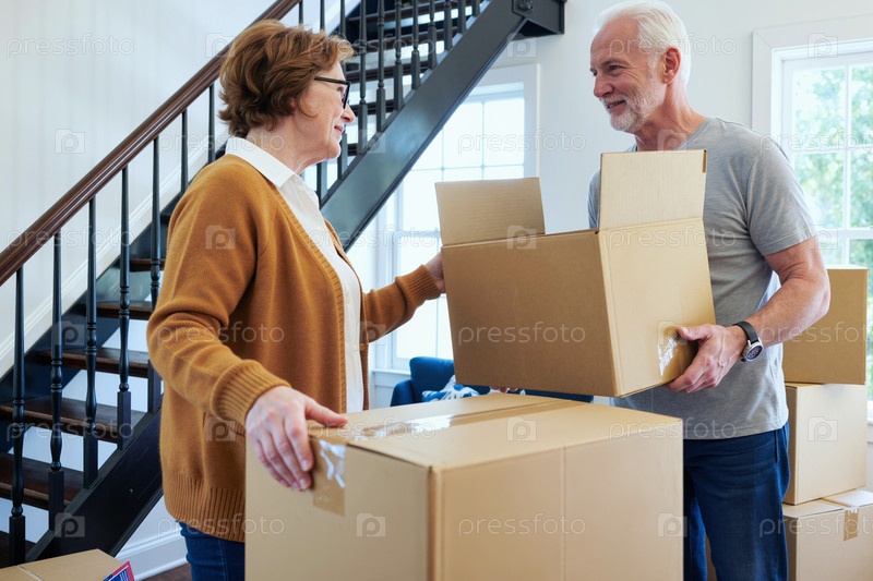 Пожилая пара улыбается, разрабатывая коробки для перемещения в помещении