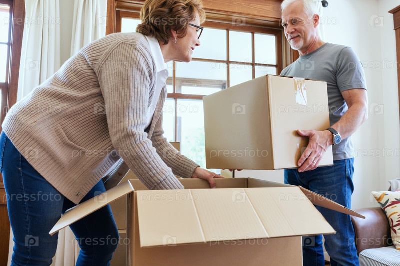 Пары среднего возраста упаковывают картонные коробки вместе в помещении