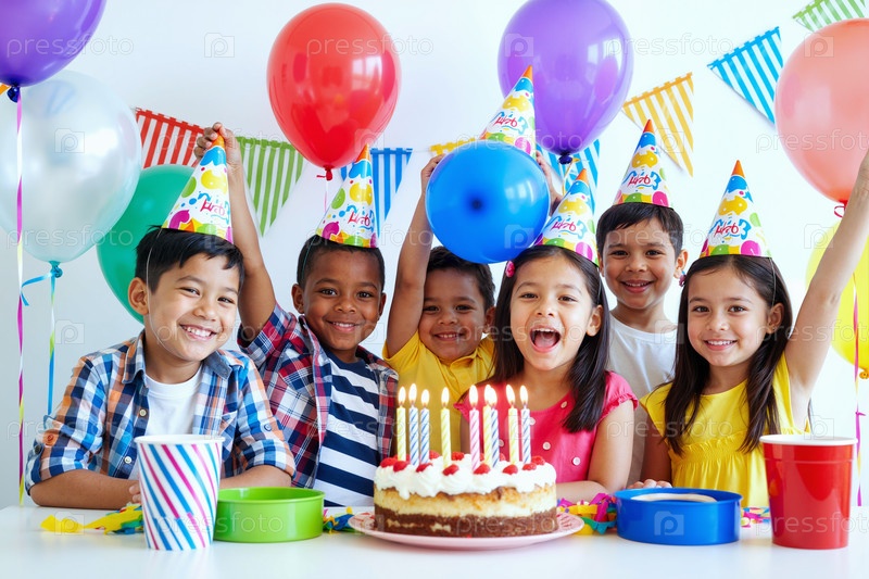 Группа разнообразных детей празднует день рождения с шариками и тортом