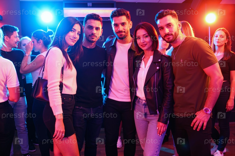 Группа друзей-молодых взрослых, позирующих вместе на вечеринке в ночном клубе