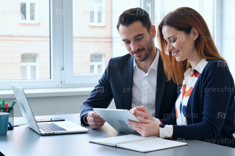 Молодой мужчина и женщина сотрудничают с помощью цифрового планшета в офисе
