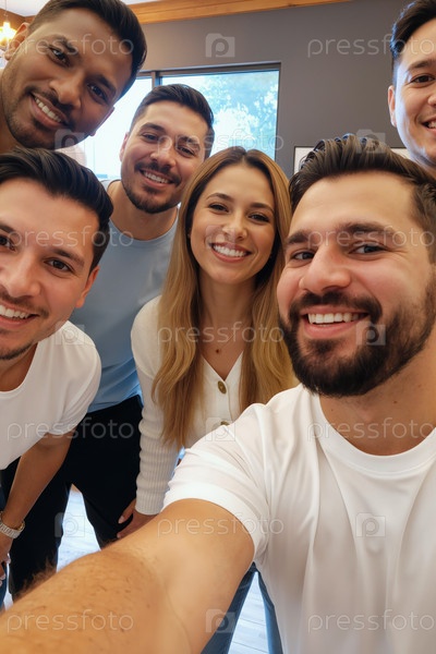 Группа молодых взрослых мультиэтнических друзей, улыбающихся и позирующих для селфи в помещении
