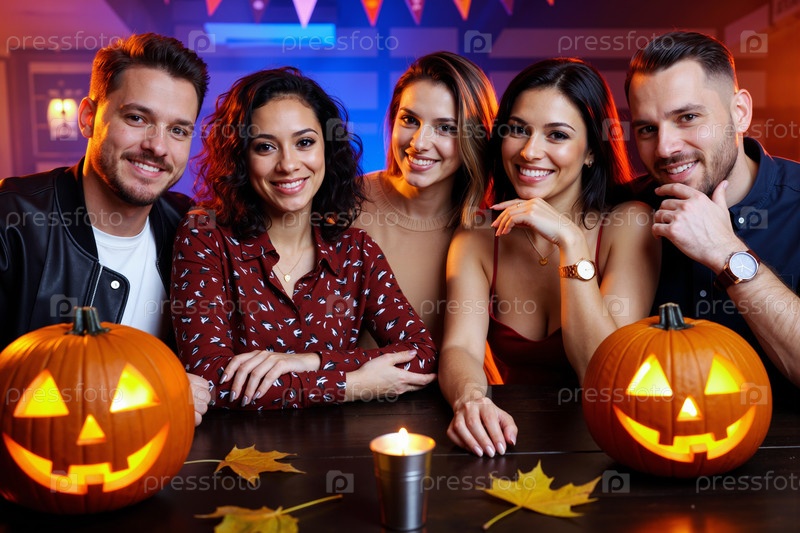 Группа друзей молодых взрослых, улыбающихся и празднующих Хэллоуин в помещении
