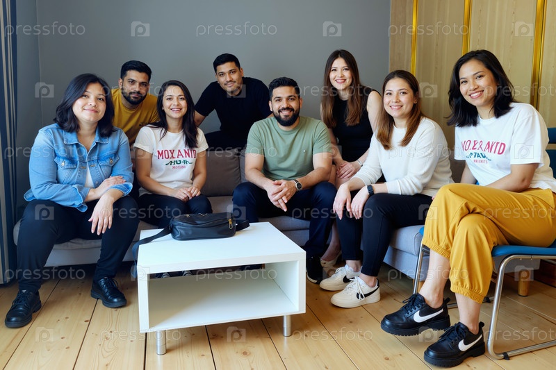 Мультиэтнические молодые взрослые сидят вместе в помещении, улыбаются и расслабляются
