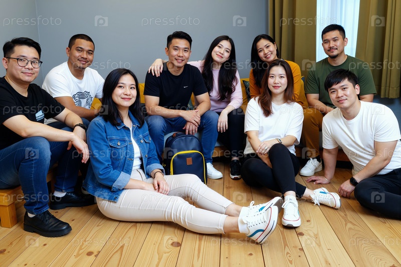 Группа молодых взрослых азиатских мужчин и женщин, сидящих вместе и улыбающихся в помещении
