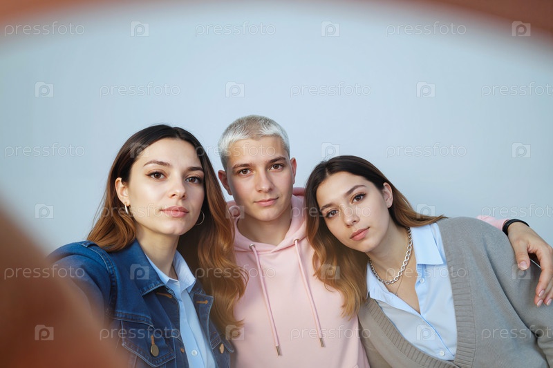 Портрет трех молодых взрослых, делающих селфи и смотрящих на камеру