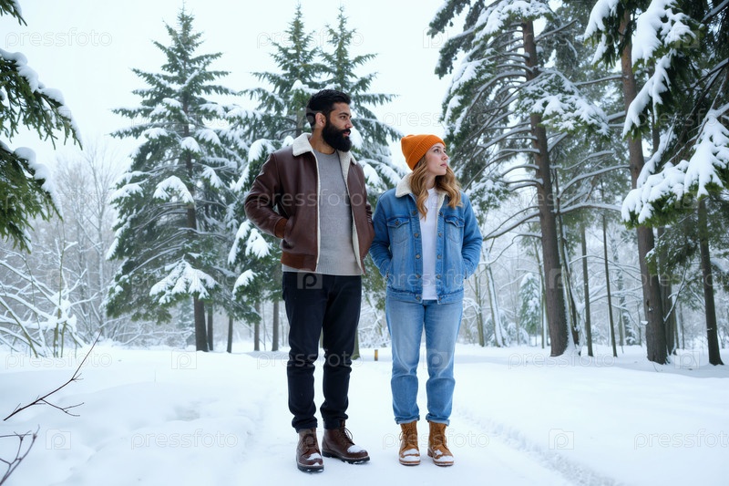 Молодая женщина и молодой человек вместе гуляют в снежном зимнем лесу