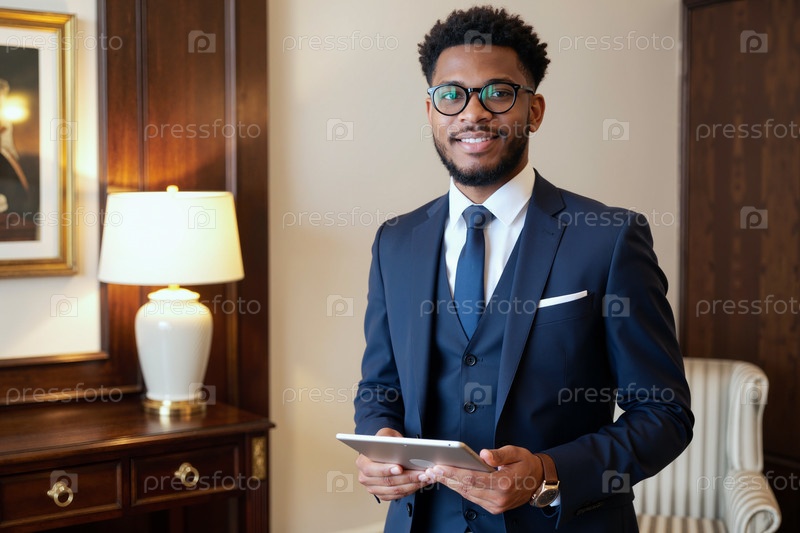 Портрет молодого взрослого чернокожего мужчины в костюме, держащего цифровой планшет и улыбающегося