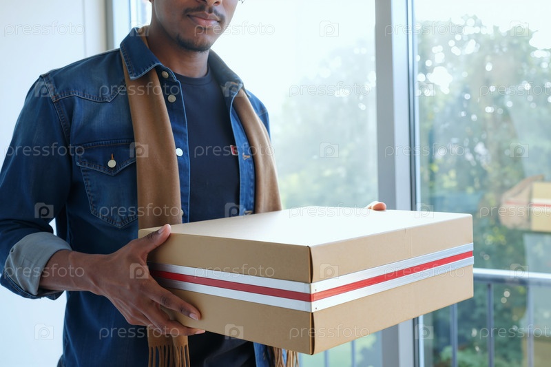 Молодой взрослый чернокожий мужчина держит картонную коробку, стоящий возле окна в помещении