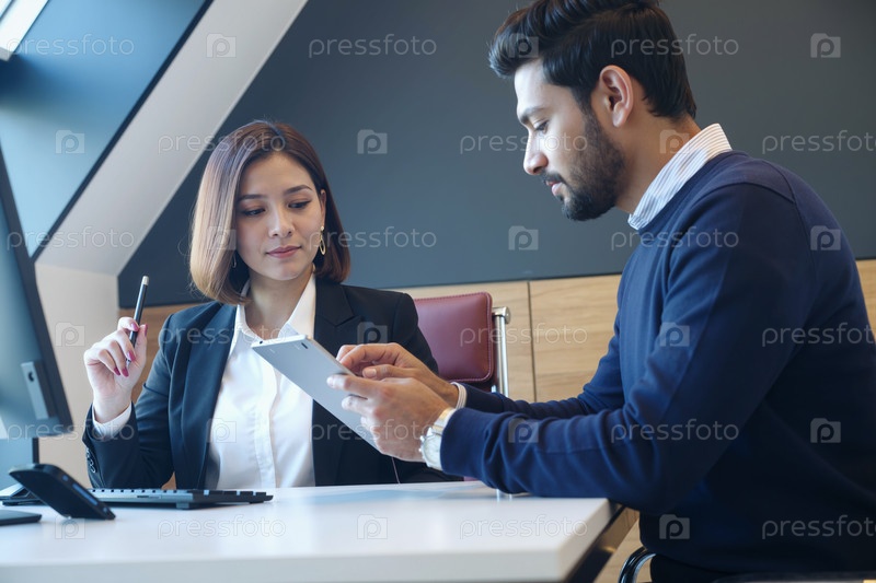 Молодой человек объясняет детали проекта молодой азиатской женщине в офисе