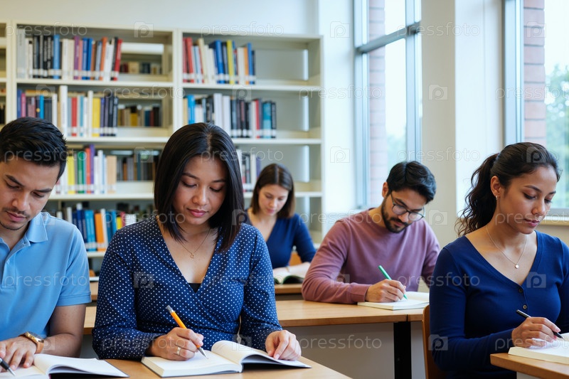 Мультиэтнические молодые взрослые учатся вместе в библиотечном классе