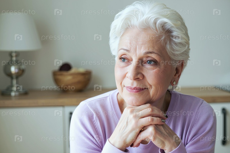 Старшая женщина улыбается, сидя дома и оглядываясь в сторону