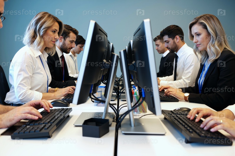 Молодые взрослые и латиноамериканские офисные работники печатают на настольных компьютерах