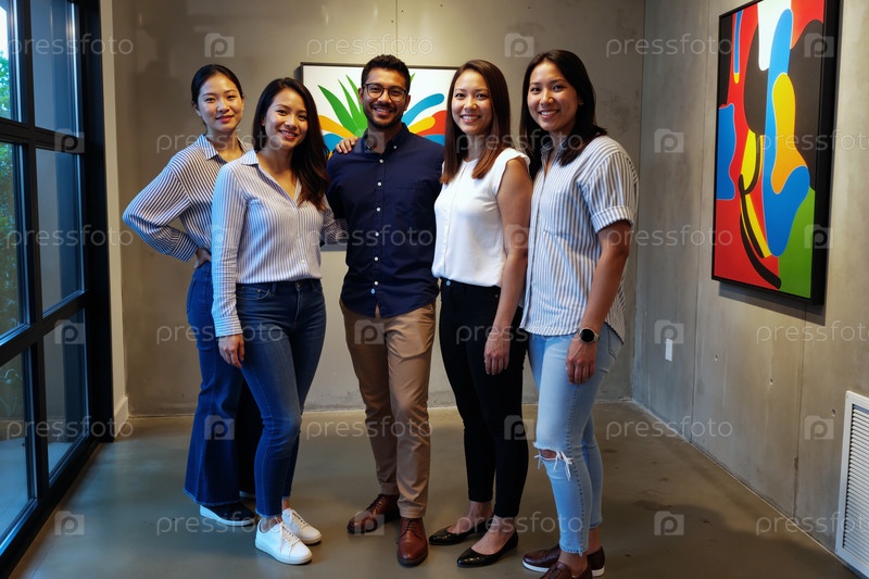 Группа молодых мультиэтнических профессионалов, улыбающихся и позирующих в помещении