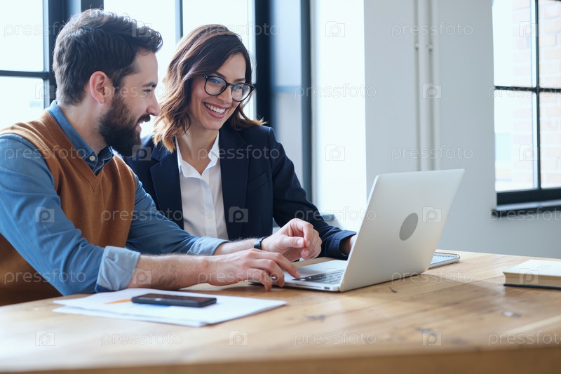 Молодой взрослый мужчина и женщина, сотрудничающие на ноутбуке в офисной обстановке