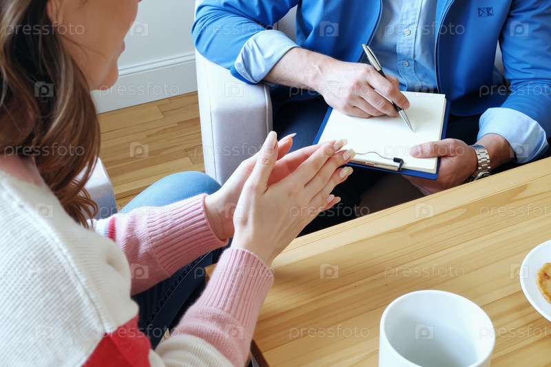 Молодая женщина консультирует мужского терапевта, который делает заметки во время сеанса