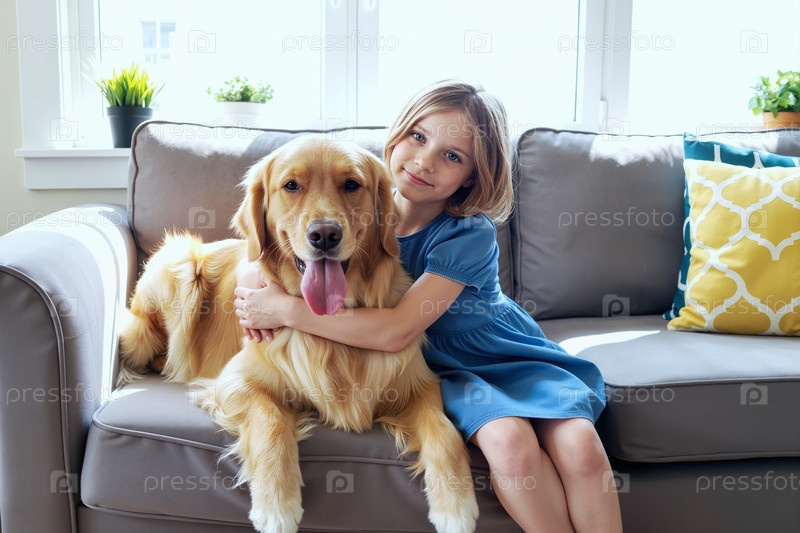 Девушка обнимает собаку-золотого ретривера, сидя на диване в помещении