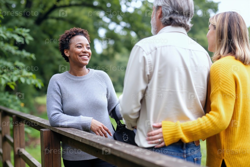 Молодая взрослая чернокожая женщина улыбается, приветствуя пару средних лет
