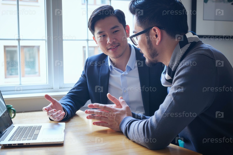Два молодых взрослых азиатских мужчины обсуждают бизнес-стратегию на рабочем столе