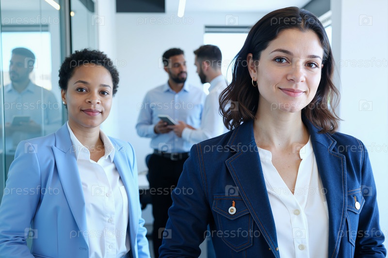 Портрет молодой взрослой женщины и чернокожей женщины, стоящей в офисе