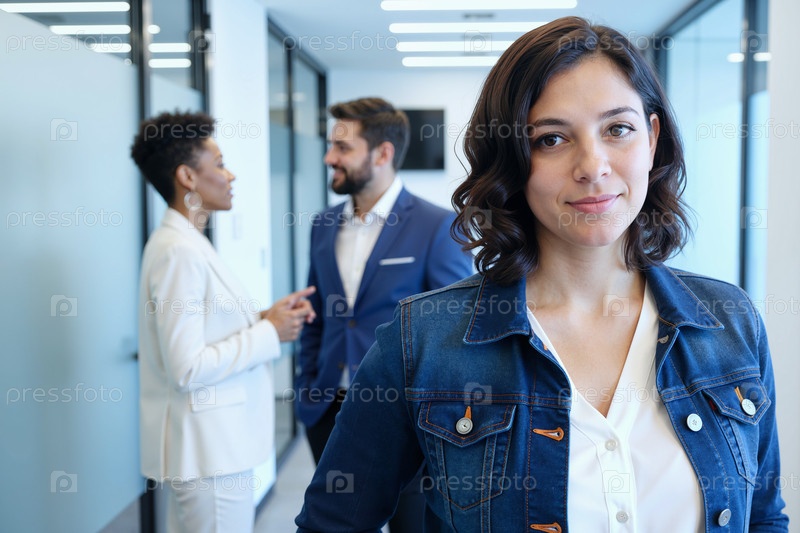 Портрет молодой взрослой женщины, стоящей в современной офисной среде