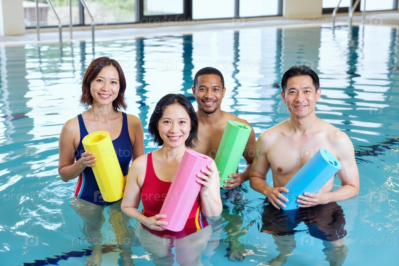 Группа молодых взрослых азиатских и чернокожих людей, улыбающихся в то время как они держат плавающие бассейны